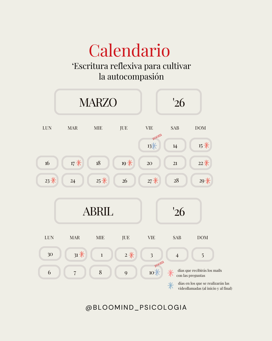 *El zoom quedará grabado para quien no pueda asistir, pero únicamente la parte de las explicaciones teóricas y prácticas para mantener la intimidad de lo compartido.
